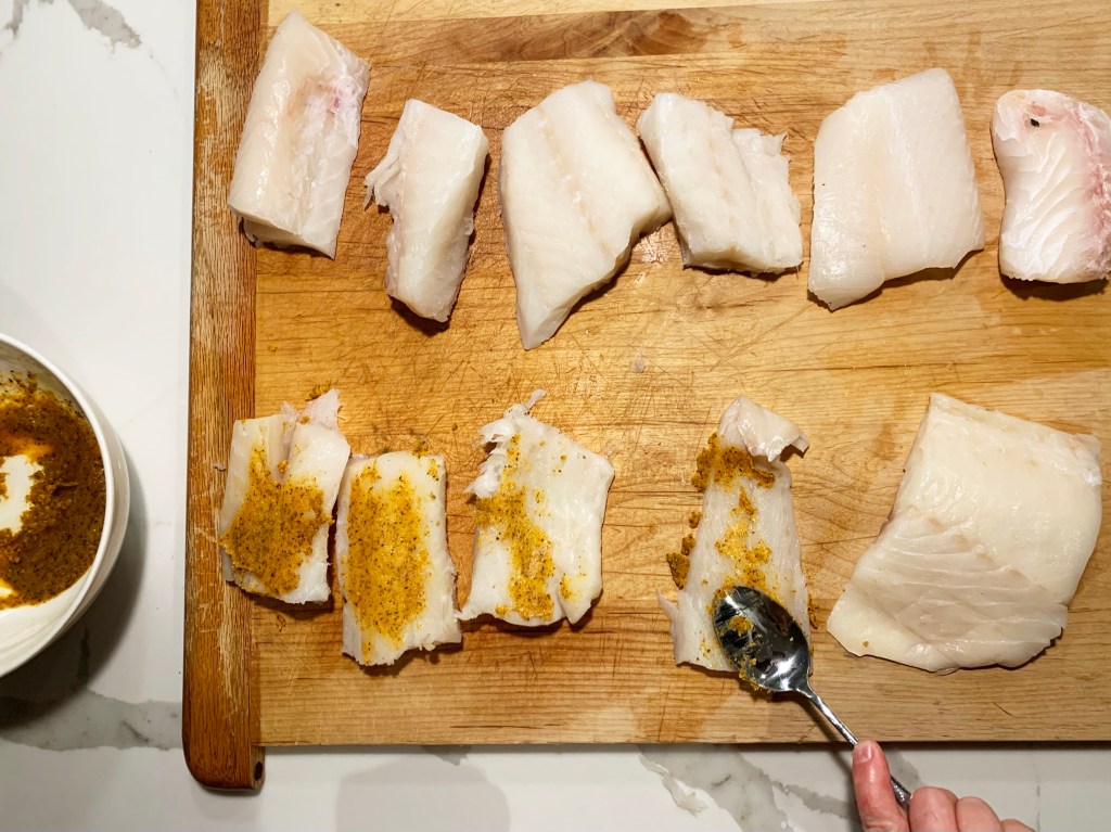 Rub seasoning mixture over each halibut filet and chill for 30 minutes.