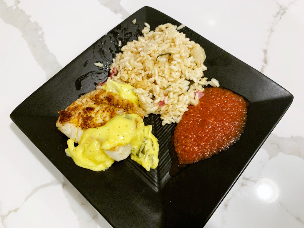 In a separate pan, saute rice with olive oil and half of the vinegar reduction until rice is browned.