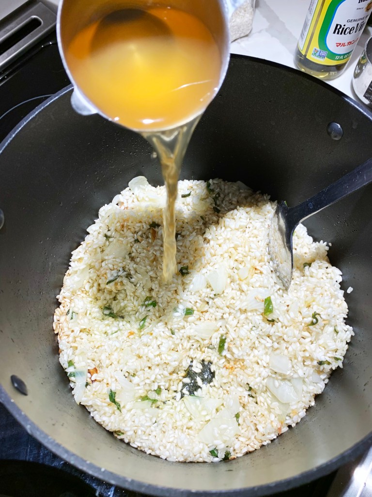 For the risotto, combine rice vinegar, chopped onions, and scallions in a pot and simmer until reduced by half.