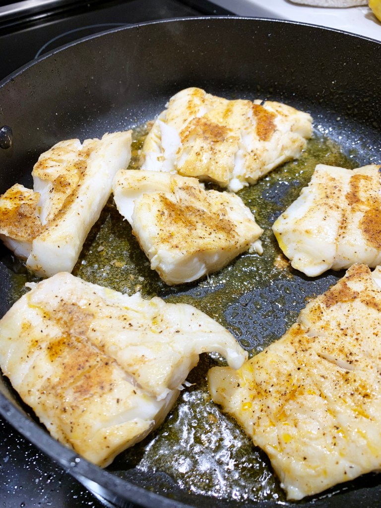 Preheat 1/2 cup olive oil for the halibut. Sauté fish until it can be easily flaked with a fork. Set aside.