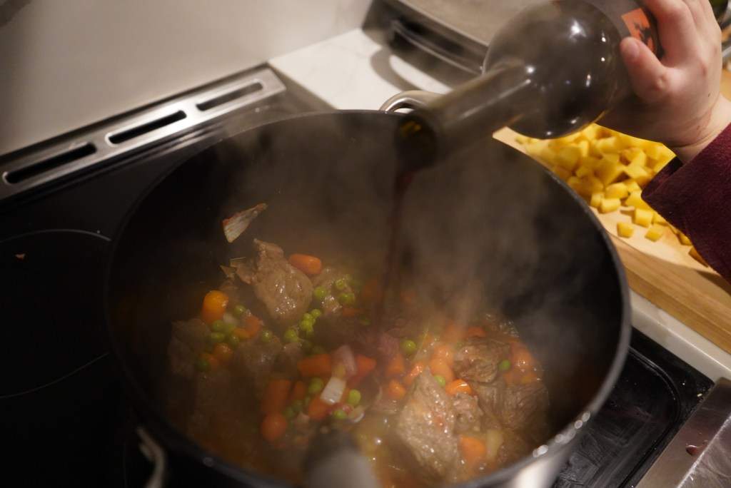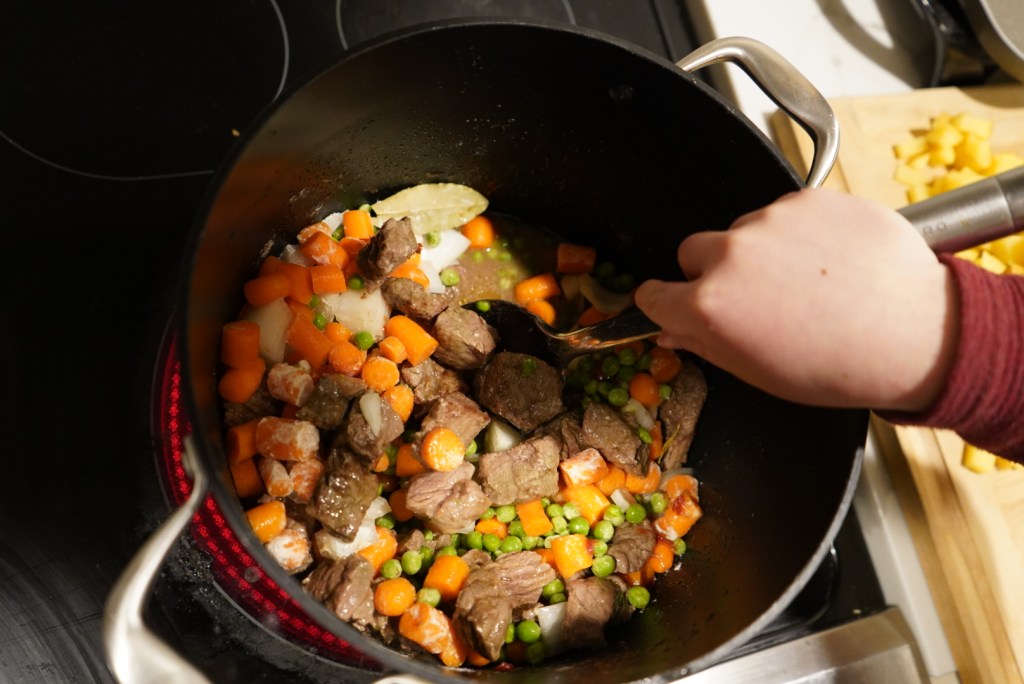 Add carrots, peas, onions, garlic mixture, bay leaves, and thyme to beef pot and cook for 2 minutes. Slowly mix in flour until incorporated.