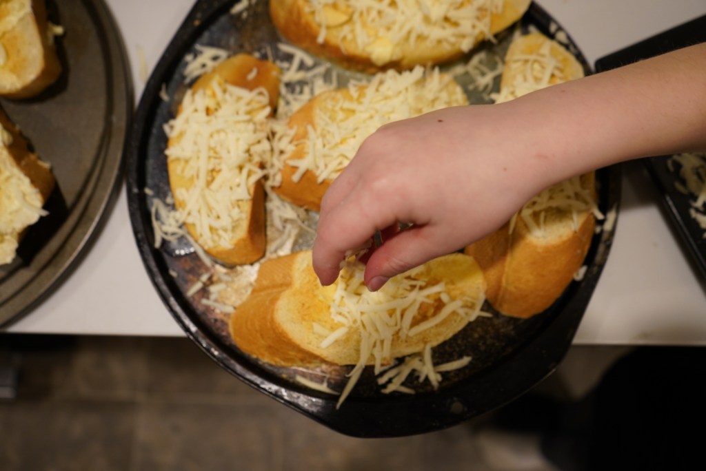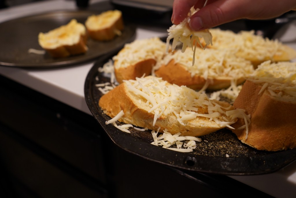 Place sliced French bread in a pan. Pour melted butter evenly over sliced bread. Distribute crushed garlic and garlic powder on each slice. Sprinkle mozzarella cheese evenly over each slice.