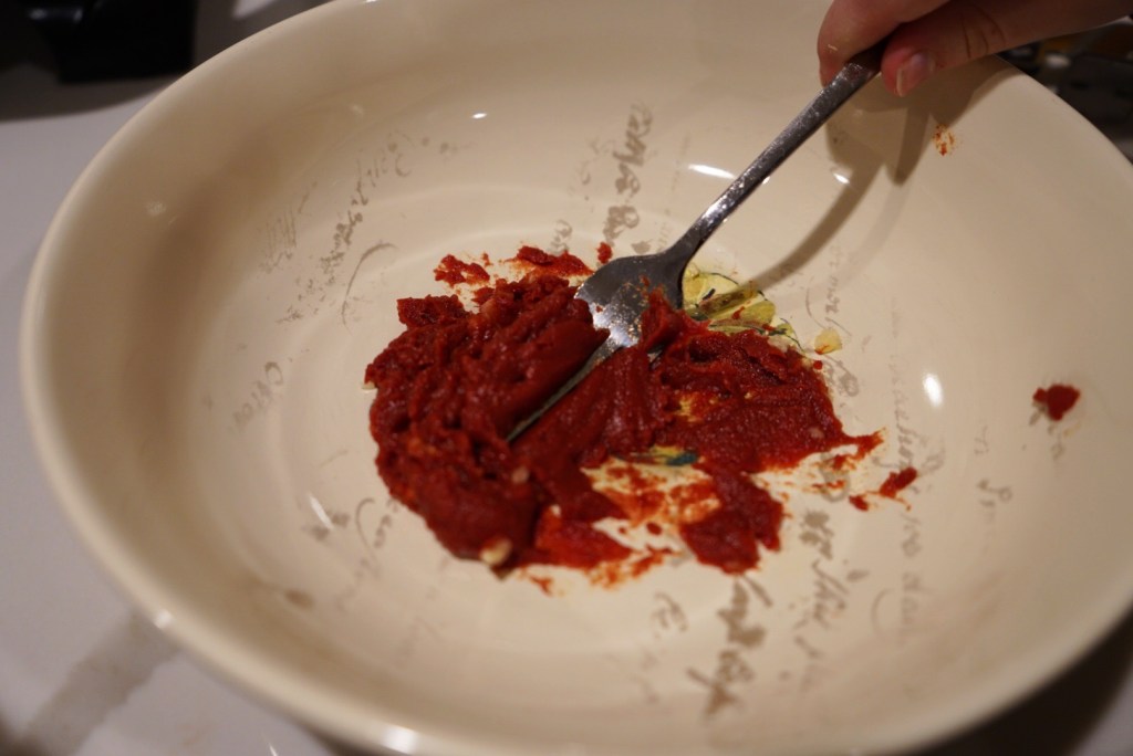 Meanwhile, combine tomato paste and garlic in a bowl and mix well.