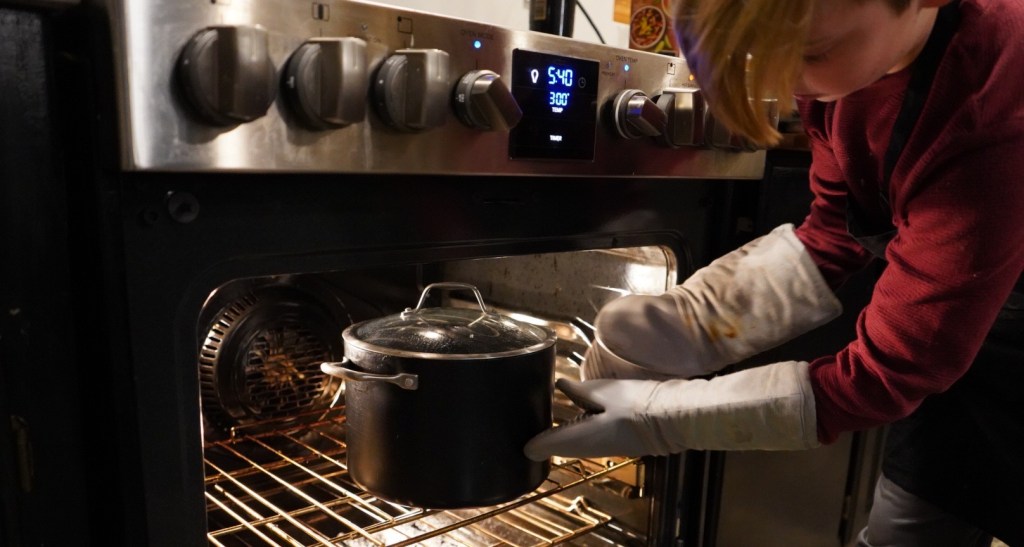 Add potatoes and place pot in preheated oven to bake for 45 minutes.
