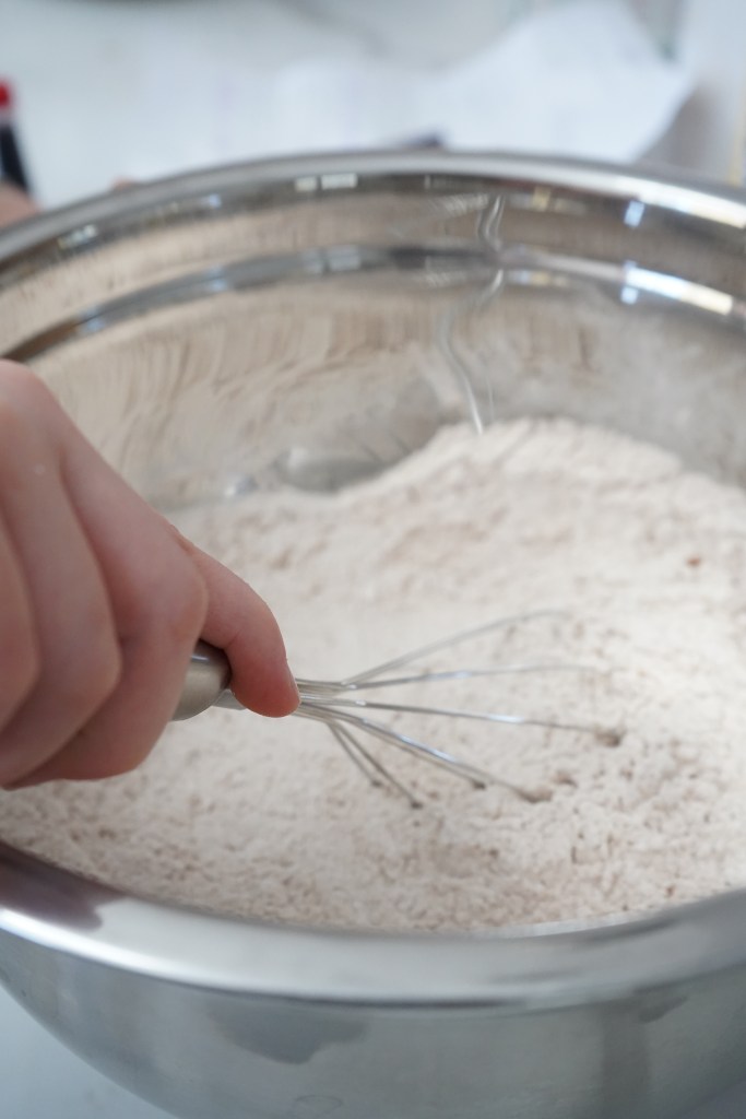 In a separate bowl, combine flour, baking soda, salt, and cocoa powder with a whisk.