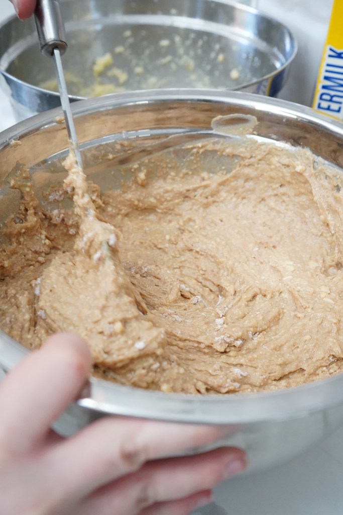 Add wet ingredients to dry ingredients and mix with a rubber spatula.