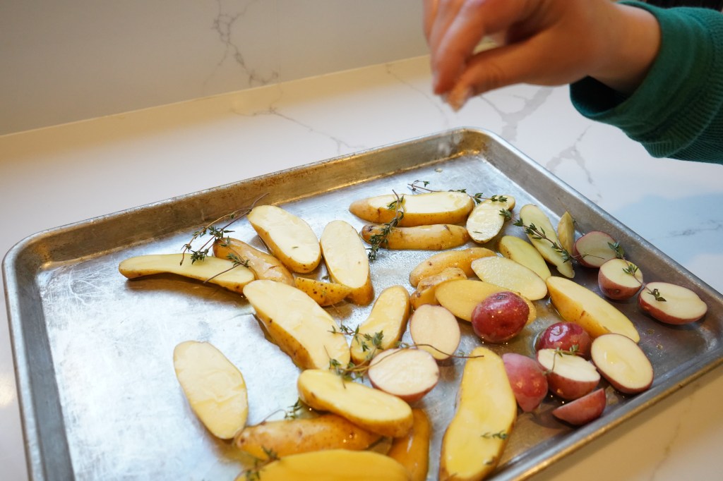 Place fingerling potatoes on a baking sheet. Drizzle with olive oil and top with salt and thyme sprigs. Place in preheated oven with salmon and bake for 15 minutes.
