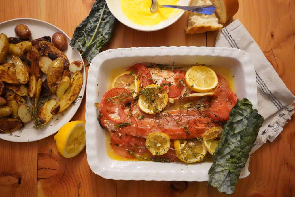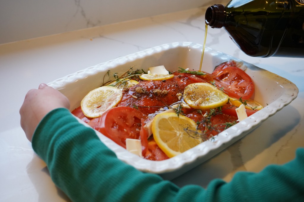 In a large Pyrex dish, arrange salmon filets. Top with remaining ingredients for lemon baked salmon and tomatoes. Place in oven preheated to 400 degrees F and bake for 25 minutes.