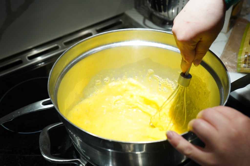 Boil water in a large pot and place heat proof bowl with egg yolks on top to create a double boiler. Strain the tarragon pieces out of vinegar mixture, then add mixture to egg yolks and mix vigorously until thick. Slowly stir in clarified butter, salt, and pepper. Set aside.