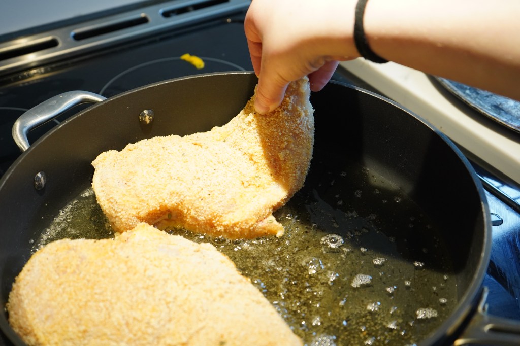Preheat oil to 325 degrees. Place chicken in oil and fry until chicken reaches internal temperature of 170 degrees to be safe.